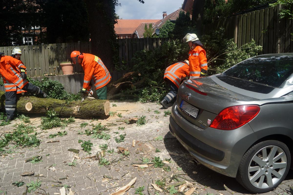 Bissendorf (kh). Es war schon ein merkwürdiges Bild, dass sich einem Bissendorfer Anwohner bot, als er am Donnerstag, 30. Juli vor seine Haustür trat. „Ich lag eben noch auf dem Sofa und hörte mehrfach ein ‚Knick Knack‘, ich dachte, die Gartentür sei nicht richtig zu“, sagte der verdutzte Mann. „Eine Minute später rumste es gewaltig und dann lag dieser dicke Ast auf meinem Auto.“ Gegen 13:30 Uhr löste sich ein Ast einer alten Eiche mit ca. 50 cm Durchmesser von dem Baum am Bissendorfer Knibbeshof und stürzte geradewegs auf den Hof, auf dem das Auto des Geschädigten geparkt war. Einsatzkräfte der Freiwilligen Feuerwehr Bissendorf waren zum Ort des Geschehens gefahren und zersägten den dicken Ast in transportfähige Stücke. Dass bei diesem Zwischenfall niemand verletzt wurde, grenzt fast an ein Wunder, denn umliegend wohnende Kleinkinder spielen regelmäßig auf diesem Hof. „Es ist eine Krux, auf der einen Seite darf man die alten Eichen nicht zurückschneiden, auf der anderen Seite passiert so etwas“, meint Viktor Wächter von der Erbengemeinschaft, der das Grundstück gehört. „Kaum auszumalen, was passiert wäre, wenn sich Personen auf dem Hof befunden hätten“, führt Wächter fort und richtet sich an Bissendorf Ortsbrandmeister Jörg Pardey. „Der Ast hat wahrscheinlich bei dem Sturm am Samstag schon etwas abbekommen“, meint Pardey und führt fort „da ist dann Gefahr in Verzug.“ Für die Besitzer von Grundstücken mit großen Bäumen stellt sich immer wieder die Frage nach der Sicherheit auf Kosten des Schutzes der Bäume. Eine allgemeine Lösung gibt es zu dieser Thematik aktuell noch nicht. Das unter dem Ast begrabene Auto erlitt erheblichen Sachschaden in Höhe von mehreren Tausend Euro.