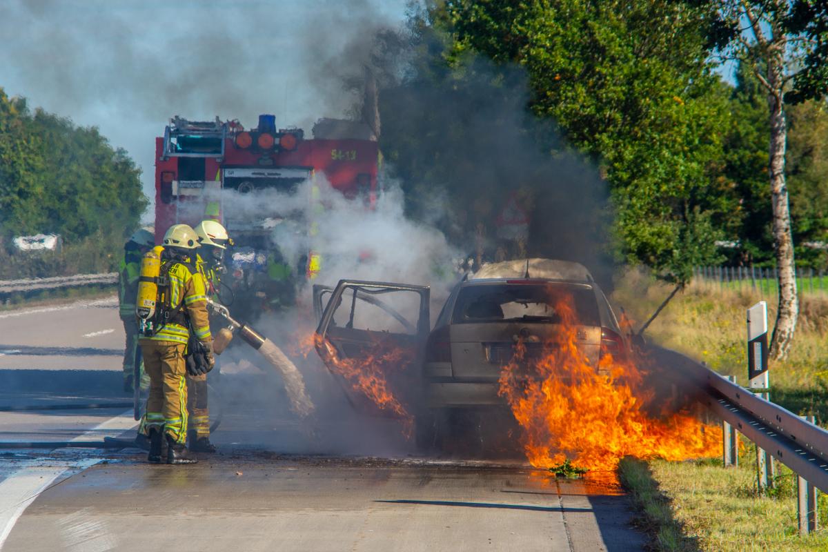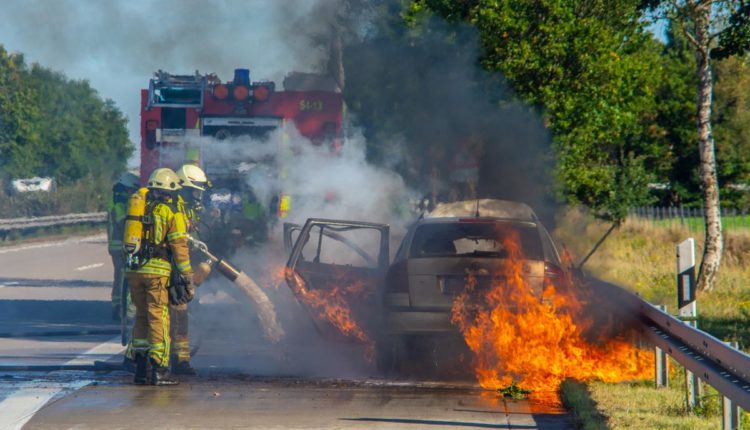 Bissendorf-Wietze (kh) Am Montag, 7. Oktober kam es auf der Bundesautobahn A352 in Höhe Bissendorf-Wietze zu einem verheerenden Fahrzeugbrand. Eine Frau aus Hamburg war mit ihren fünf und acht Jahre alten Kindern auf dem Weg nach Norden, als sie kurz hinter dem Rastplatz ein Rumpeln an ihrem Skoda bemerkte. Sie lenkte das Fahrzeug auf den Seitenstreifen und stellte ein Warndreieck auf, während die ältere Tochter bemerkte, dass Rauch unter der Motorhaube hervorkroch. Die Mutter brachte die Kinder rasch in Sicherheit und bei einem Busfahrer unter, der sich um die Kleinen kümmerte. Beim Eintreffen der Polizei war zunächst kein Fahrzeugführer auszumachen, es quoll dichter, beißender Rauch aus dem Wagen, der auch die Sicht auf der Gegenfahrbahn behinderte. Nachdem unser wedeMAGAZIN-Reporter die Autofahrer einweisen musste, eine Rettungsgasse zu bilden, kämpfte sich die Feuerwehr Kaltenweide mit zwei Löschfahrzeugen durch die kaum passierbare Autobahn. Beim Eintreffen der Löschmannschaft am Einsatzort brannte der Pkw bereits lichterloh, austretendes Benzin setzte auch die angrenzende Vegetation in Brand, die Reifen platzten mit lautem Knall. Der Löschtrupp ging unter Atemschutz an das brennende Fahrzeug heran, es brauchte allerdings eine ganze Weile, den komplizierten Brand des Kraftstofftanks zu löschen, der zwischendurch mit bedrohlichem Zischen geborsten war. Nach rund 30 Minuten waren die Flammen unter Kontrolle, die Fahrerin musste den Tränen nahe untätig dabei zusehen, wie die Einsatzkräfte ihre Habseligkeiten aus dem Autowrack bargen. Kuscheltiere, Decken und persönliche Gegenstände lagen teils verrußt, teils durchnässt auf dem Asphalt. Unterdessen näherten sich der Frau zwei Polizisten, die ihr ein paar neue Kuscheltiere und etwas zu Essen für die Kinder übergaben. Gerührt bedankte sich die Fahrerin bei den beiden Polizeibeamten. Da auch nach den Löscharbeiten weiterhin Benzin aus dem Fahrzeug auslief und die Tanks der vorhandenen Löschfahrzeuge annähernd leer waren, wurde ein weiteres Fahrzeug der Feuerwehr Krähenwinkel nachalarmiert, um den Brandschutz sicherzustellen. Die A352 blieb während der Löscharbeiten in Richtung Norden vollständig gesperrt, erst gegen 13 Uhr floss der Verkehr wieder einspurig, während die Bergungsarbeiten noch liefen.
