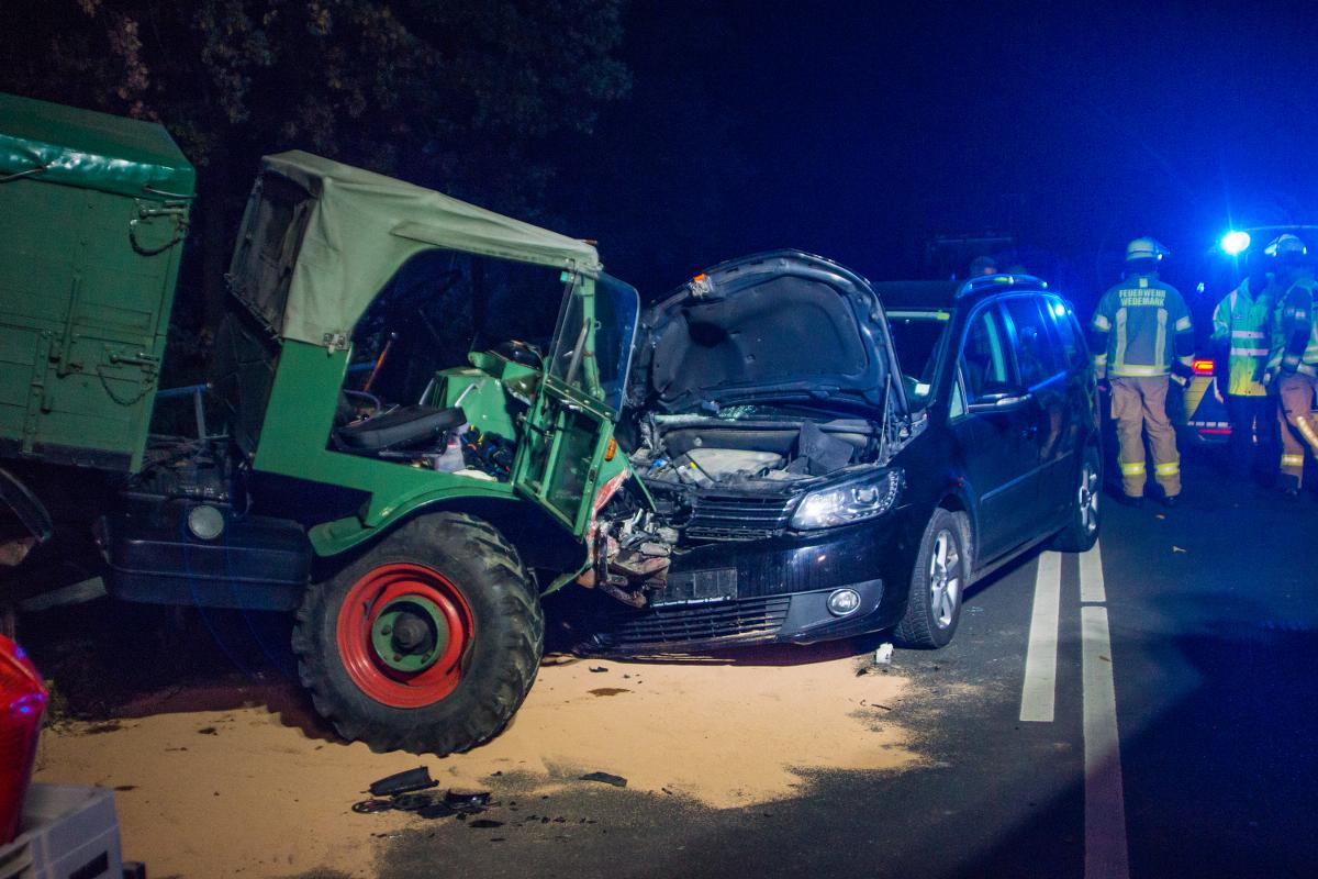 Bissendorf-Wietze (kh) Zu einem spektakulären Verkehrsunfall kam es am Dienstag, 13. November gegen 17:30 Uhr auf der Burgwedeler Straße (L383). Ein 64 Jahre alter Mann aus Burgwedel befuhr mit einem Unimog aus den 1960er Jahren die L383 aus Bissendorf kommend in Richtung Burgwedel. Auf der Autobahnbrücke über die A352 schätzte ein hinter ihm fahrender 24-Jähriger die Geschwindigkeit des Vordermanns falsch ein und fuhr diesem hinten auf, woraufhin der Unimog in den Gegenverkehr geriet und dort frontal mit dem Volkswagen Touran eines 34-jährigen Garbseners kollidierte. Die Ehefrau des VW-Fahrers war wiederum in einem separaten Fahrzeug hinter ihrem Mann unterwegs, konnte aber rechtzeitig bremsen. Durch den Aufprall wurde der Unimog mit dem Hinterteil auf die Leitplanke des linken Fahrstreifens katapultiert, der Fahrer erlitt eine Kopfwunde, die vor Ort erstversorgt und später im Krankenhaus behandelt werden musste. Auch der Fahrer des Touran kam mit einer Armverletzung sowie dem Verdacht auf eine Gehirnerschütterung in die Klinik. Der Unfallverursacher erlitt einen Schock und wurde ebenfalls vorsorglich in ein Krankenhaus gebracht. Die Feuerwehr aus Bissendorf-Scherenbostel wurde zum Unfall alarmiert, um die stark auslaufenden Betriebsstoffe der Fahrzeuge mit Bindemittel abzustreuen. Da ein Bissendorfer Löschfahrzeug derzeit in Reparatur ist, wurde zur Unterstützung die Feuerwehr aus Wennebostel hinzugezogen, die zudem die Unfallstelle zur Schadensaufnahme durch die Polizei ausleuchtete. Insgesamt waren 16 Einsatzkräfte der Freiwilligen Feuerwehr im Einsatz. Die Burgwedeler Straße blieb während der Bergungsarbeiten in beide Richtungen bis etwa 19 Uhr voll gesperrt.