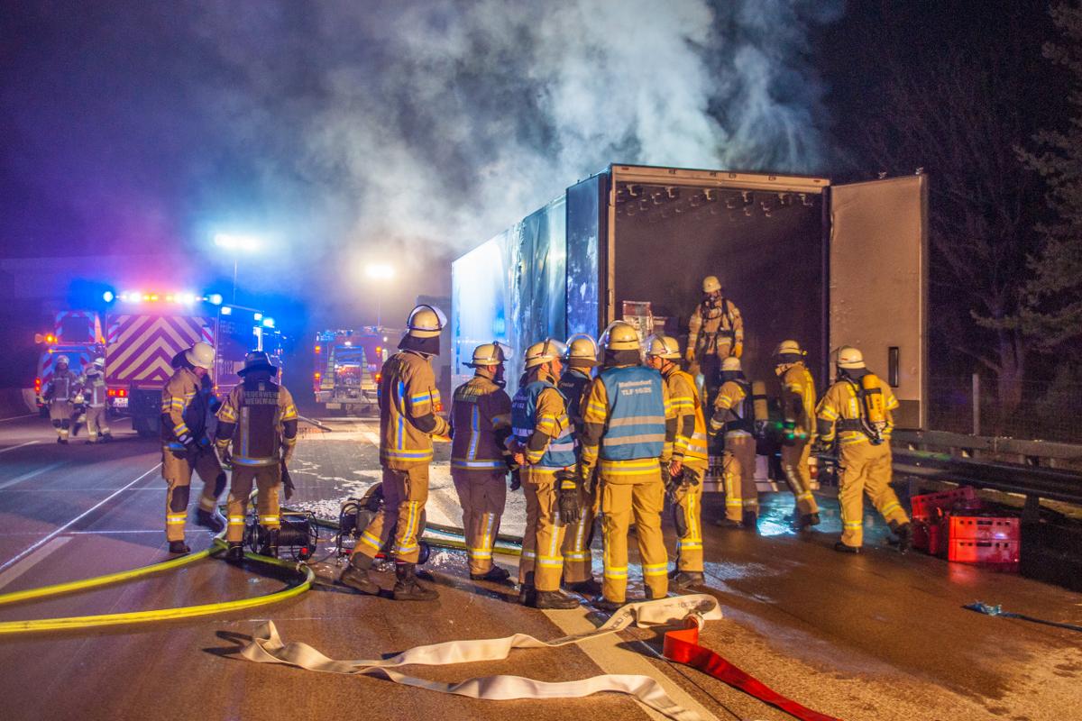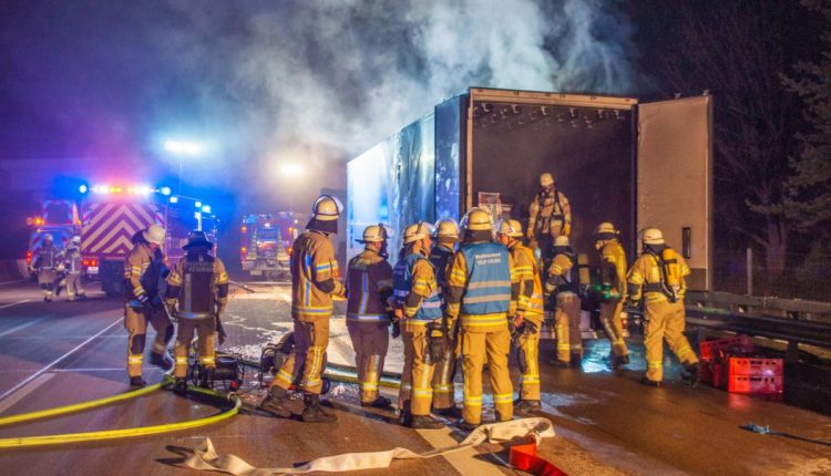 Gailhof/Berkhof (kh) Mitten in der Nacht von Donnerstag auf Freitag wurden die Einsatzkräfte der Freiwilligen Feuerwehr Wedemark zu einem Lkw-Brand auf die A7 alarmiert. Um 1:26 Uhr schrillten die Pieper der Kameradinnen und Kameraden der Ortswehren Gailhof, Mellendorf und Wennebostel, die binnen weniger Minuten mit rund 35 Einsatzkräften auf der Autobahn zwischen Gailhof und Berkhof waren. Die Feuerwehr Elze wurde zur Unterstützung nachalarmiert. Ein mit Frischfleisch beladener Lkw-Auflieger stand brennend auf dem Seitenstreifen, der Fahrer hatte das Zug-Gespann noch an den Rand fahren und einen Notruf absetzen können. Ursächlich war wohl eine defekte Bremse an der rechten Hinterachse des Aufliegers verantwortlich, die glühend einen Reifen in Brand gesetzt hatte. Das Feuer breitete sich unter dem Auflieger aus und griff auch auf Teile der Seitenwände über. Um die Flammen effektiv bekämpfen zu können, war jedoch zunächst Muskelkraft gefragt. In voller Ausrüstung schleppten zahlreiche Atemschutzgeräteträger von Hand die Transportkisten aus dem Lkw und lagerten sie auf der Autobahn zwischen. Hinter der Verkleidung loderten noch immer Flammen, die die Einsatzkräfte jedoch rasch löschen konnten. Es brauchte nicht lange, bis „Feuer aus“ gemeldet wurde. Auch das neue Hygiene-Konzept der Feuerwehr kam in diesem Einsatz zum Tragen. Das Wennebosteler Logistik-Fahrzeug wurde kurzerhand zu einer Umkleidekabine für die verrußten und verdreckten Atemschutzträger umfunktioniert, die sich noch vor Ort in eigens hierfür angeschaffte Trainingsanzüge umziehen konnten. Die kontaminierte Einsatzkleidung wird so noch vor Ort in Säcke verpackt und zum Reinigen in die Wäscherei gebracht. Zufrieden mit dem Gesamt-Verlauf des Einsatzes rückten die letzten Feuerwehr-Einsatzkräfte gegen 4 Uhr in der Früh ein, bevor für viele nur wenige Stunden später der Arbeits-Alltag wieder beginnen sollte. Während des Einsatzes hatten die Einsatzkräfte zwei der drei Fahrspuren für den Verkehr gesperrt, so dass es zu minimalen Behinderungen auf der Autobahn kam. Die Polizei ließ bis zur Bergung des Zug-Gespanns einen Fahrstreifen weiterhin komplett gesperrt.