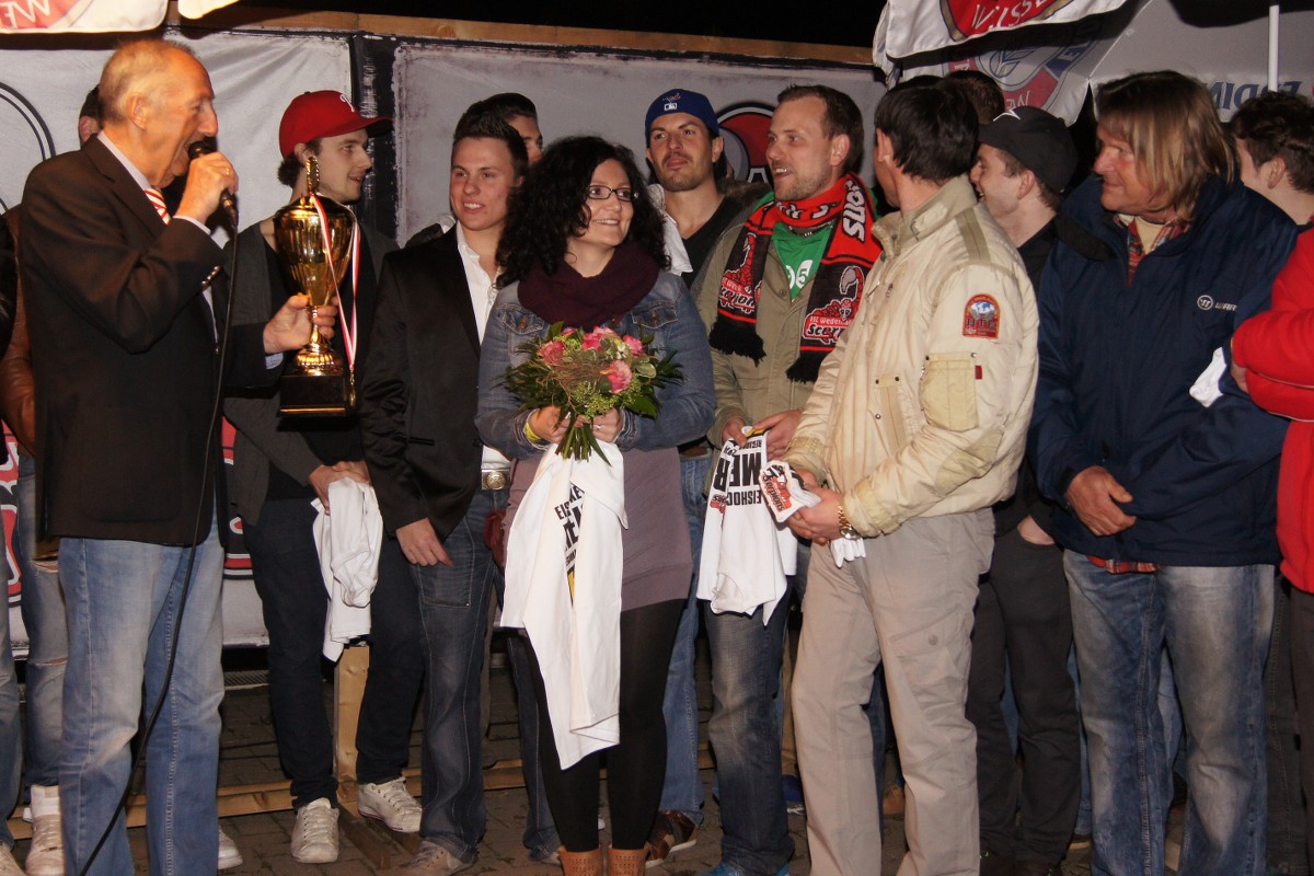 Wedemark (kh). Eine Woche nach dem erfolgreichen Final-Sieg der Play-Off Serie in der Regionalliga Nord lud der ESC Wedemark Scorpions Anhänger und Freunde nach Mellendorf ins Ice House Restaurant ein, um dort ausgelassen ihren Meister-Titel zu feiern. Rund 200 Fans und Freunde waren der Einladung von ESC-Vorsitzenden Jochen Haselbacher gefolgt, um gemeinsam mit ihrer Mannschaft auf den Titel anzustoßen. Auch Bürgermeister Helge Zychlinski ließ es sich nicht nehmen, ein paar Worte an die Mannschaft und die Gäste zu richten. „Dank Familie Haselbacher und das Mellendorfer Eishockey kennt man die Wedemark in ganz Deutschland und darauf können sie zu Recht stolz sein“ sagte Zychlinski. Als Zeichen der Verbundenheit des Eishockeys mit der Wedemark überreichte Haselbacher dem Bürgermeister eine der Meister-Medaillen, die nach dem 4:1 Final-Sieg gegen den EHC Wolfsburg am vergangenen Sonntag an die Mannschaft ausgegeben wurden. Im Anschluss stellte Haselbacher jeden Spieler noch einmal einzeln vor und überreichte jedem ein eigens für diese Veranstaltung angefertigtes Meister-Shirt. Der Wunsch, in der kommenden Saison in der Oberliga zu spielen, wurde sowohl von den Spielern, wie auch der Vereinsführung und von den Fans geäußert, doch der Weg dorthin ist nicht gerade einfach. „Nun liegt es an den Sponsoren, das Budget für die dritthöchste Liga zusammen zu bekommen“ erklärte Haselbacher und appellierte in diesem Zusammenhang an die Bereitschaft „der bisherigen und zukünftigen Sponsoren“, den Verein für diesen möglichen Schritt zu unterstützen und somit die Wedemark wieder zu einer bekannten Größe im Eishockey zu machen. Krönendes Highlight der Feier war ein musikalisch begleitetes Feuerwerk der Firma Rohr, abgestimmt auf bekannte Lieder der Scorpions-Spiele. Gefeiert wurde noch bis in die frühen Morgenstunden. Für die Wedemark Scorpions steht nun erst einmal die Sommerpause bevor, die der Verein allerdings mit Planungen für die kommende Saison sowie die Sponsoren-Akquise verbringt.