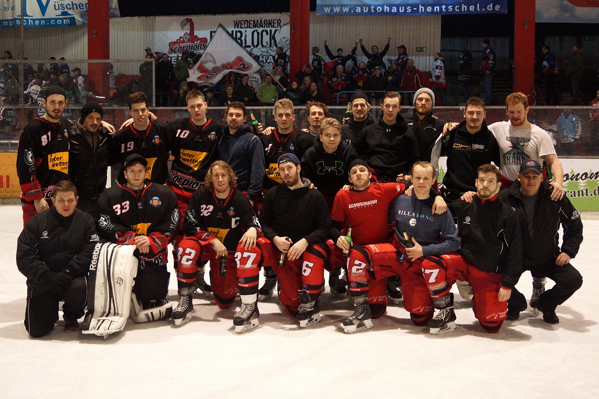 Mellendorf (kh) Es war die erste Saison in der Oberliga Nord für die junge Mannschaft aus dem Mellendorfer Eisstadion. Diese endete nun am vergangen Freitag im Viertelfinale der Playoffs gegen den Tabellenführer, die Hannover Indians. In der „best of seven“ Serie hatten die Hannoveraner schlichtweg den längeren Atem. Es gelang den Scorpions in den vorangegangenen Spielen zwar immer wieder, den Spitzenreiter bloßzustellen, teilweise sogar in Führung zu gehen und relativ knappe Ergebnisse zu erzielen, einmal sogar in der Verlängerung, am Ende schien die Mannschaft um das Trainergespann Fiete Bögelsack und Ralf Meyer in den letzten beiden Viertelfinalspielen jedoch die Kraft zu verlassen. Vor rund 1.300 Zuschauern im Ice House Mellendorf trafen die beiden Viertelfinalisten zum vierten Mal aufeinander. Die Indians hatten die dicht aufeinander folgenden Playoff-Spiele bislang für sich entscheiden können, dieses vierte Spiel war also entscheidend für das Saison-Aus auf Wedemärker Seite und die Teilnahme am Halbfinale für die Hannoveraner. Mit einem 0:5 (0:1, 0:2, 0:2) standen die Indians letztlich als Halbfinalisten fest, wobei die Saison für die Wedemärker somit beendet war. Verloren haben die Wedemark Scorpions jedoch nicht wirklich: Sie haben ihr Saison-Ziel, den Klassenerhalt zu schaffen, mit der Teilnahme an den Playoffs erreicht und sind somit auch in der kommenden Saison berechtigt, wieder in der Oberliga Nord anzutreten. „Wir konnten ganz ohne Druck auf den Schultern in die Playoffs gehen und frei aufspielen“ meint Trainer Ralf Meyer. Die Scorpions haben nun Zeit, das Training ein wenig zu reduzieren und über die sehr bewegte Saison nachzudenken, bevor es in ein paar Wochen mit dem Sommertraining weitergeht. Man hatte in Mellendorf mit einem ganz eigenen Konzept in die Saison gestartet. Junge Spieler und Talente aus dem eigenen, sehr starken Nachwuchs sollten das Gesicht der Mannschaft prägen. Mit einem Altersdurchschnitt von gerade einmal 22,5 Jahren ging die Wedemark mit der jüngsten Mannschaft der Oberliga an den Start. Dass manchen Spielern schlichtweg die Erfahrung in der dritthöchsten Spielklasse fehlte, sorgte anfangs dafür, dass die Scorpions recht schnell auf den letzten Tabellenplatz abrutschten. Doch einige unerwartete Überraschungen wie etwa die Siege gegen starke Teams wie den HSV oder die Harzer Falken gaben der Mannschaft neuen Mut. Im Laufe der Saison veränderte sich das Gesicht der Mannschaft nahezu komplett, als Trainer und Spieler-Manager entschieden, den Kader mit insgesamt 10 neuen Spielern neu zu besetzen. Spieler-Highlight war wohl nicht zuletzt der kanadische Neuzugang Scott Stafford, dem von Geburt an die linke Hand fehlt. Seit Anfang Februar waren immer wieder Medien-Vertreter von Zeitungen sowie aus Funk und Fernsehen im Ice House zu Gast und sorgten so dafür, dass nicht nur ganz Deutschland, sondern auch Länder wie Schweden, die Slowakei und Ungarn über das kleine Dorf im Norden Deutschlands berichteten und die Wedemark Scorpions zu einem interessanten Gesprächsthema machten. „Es war eine tolle Erfahrung, hier in der Wedemark zu spielen. Alle waren sehr freundlich und haben mich sehr herzlich aufgenommen“ sagt Stafford über seine Zeit bei den Scorpions, die er, wie er selber sagt, in der nächsten Saison gerne wieder unterstützen würde. Wie die kommende Saison allerdings aussehen wird, auch in Hinsicht auf die eventuelle Zusammenlegung der Oberligen Nord, West und Ost, das wird der Sommer zeigen. Sicher ist nur eines: Die Wedemark hat es schon einmal geschafft, Eishockey-Geschichte zu schreiben und das war sicherlich nicht das letzte Mal.