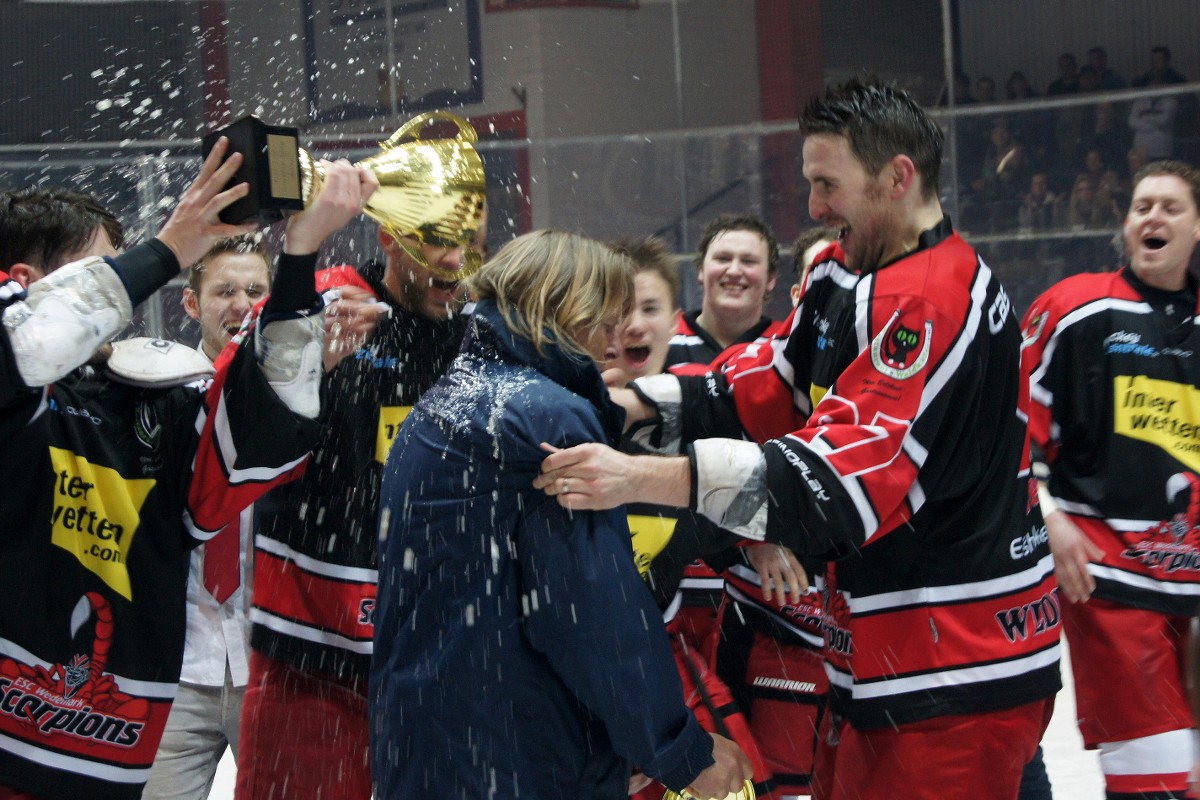 Wedemark (kh). „Das ist ja wie in alten Zeiten“ hörte man es von allen Seiten, als der ESC am vergangenen Sonntag das Play-Off Finalspiel gegen die EHC Grizzly Adams Wolfsburg im Mellendorfer Eisstadion gewann. Mit einem Endergebnis von 4:1 (1:0, 2:1, 1:0) erlangte die Mannschaft von Chef-Coach Fiete Bögelsack den Meistertitel der Regional-Liga Nord. Mehr konnten die Wedemark Scorpions in der Saison auch nicht erreichen und es war weitaus mehr, als sich so manch einer hätte träumen lassen. Doch der Weg dorthin war steinig, gab es doch im Laufe der Saison nicht nur Triumphe zu feiern, sondern auch den einen oder anderen Rückschlag wegzustecken. So mussten die Wedemärker im Final-Hinspiel am Samstag in Wolfsburg gleich um drei ihrer Spieler bangen. ESC-Stürmer Martin Berg wurde von einem Gegenspieler dermaßen hart in die Bande gecheckt, dass er bewegungsunfähig liegen blieb und mit der Trage vom Eis geholt und ins Krankenhaus gebracht werden musste. Ähnlich erging es Verteidiger Tobias Maeter nach einem Check gegen die Schulter und Stürmer Marc-André Keller nach einem harten Check, die ebenfalls ins Krankenhaus kamen. Während Maeter und Keller das Krankenhaus am selben Abend noch verlassen konnten, musste Berg die Nacht in stationärer Behandlung verbringen. Mit einer 3:4 Niederlage fuhren die Wedemärker sichtlich angeschlagen nach Hause. Zum großen Show-Down am Sonntag waren die drei Verletzten jedoch anwesend und feuerten ihre Mannschaft von der Tribüne aus an, während Fans große „Gute Besserung“ Transparente in die Südkurve gespannt hatten. Rund 600 Anhänger waren ins Ice House gekommen, um „ihre“ Scorpions auf dem Weg zum Meistertitel anzufeuern. Schon zum Einmarsch der Spieler verwandelte sich die Eishalle in ein Meer aus Wunderkerzen, die Stimmung beim Spiel war atemberaubend. Und die Fans sollten nicht enttäuscht werden, als mit der Schluss-Sirene der Sieger feststand und Götz Neumann von Niedersächsischen Eissport Verband (NEV) den Meisterschaftspokal überreichte. ESC-Verteidiger Igor Kabernuk, der mit diesem Sieg auch seinen Abschied aus dem aktiven Eishockey bekanntgab, nahm den Pokal entgegen, während Goalie Florian Holst seine Mannschaft mit einer Sektdusche abkühlte. Am kommenden Freitag, 4. April findet ab 19 Uhr die Meisterfeier der Scorpions im Ice House statt, zu der neben der Mannschaft auch alle Fans eingeladen sind.