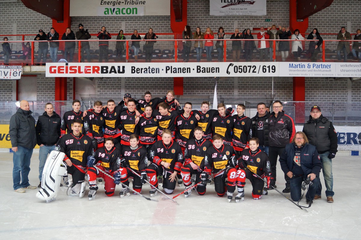 Bereits zum Beginn der Saison 2014/2015 konnte sich die sehr starke Schüler-Mannschaft des ESC Wedemark Scorpions e.V. gegen die gegnerischen Teams der Landesliga des Niedersächsischen Eissport-Verbands (NEV) durchsetzen und die Tabellenspitze für sich beanspruchen. Doch es war eine schwierige Saison für die Spieler, da einige von ihnen neben der Teilnahme am Spielbetrieb der Schüler auch noch im Kader der Jugendmannschaft in der Niedersachsenliga antraten. Für diese Spieler bedeutete das, dass sie mit jeweils 16 Spielen pro Mannschaft exakt doppelt so viele Spiele zu absolvieren hatten, wie die anderen teilnehmenden Mannschaften. Am 22. März fand letztlich das entscheidende Spiel um die Schüler Landesmeisterschaft gegen die Spielgemeinschaft SV Salzgitter/EHC Wolfsburg im Mellendorfer Hockeyzentrale Ice House statt. Die Gäste waren in einer Minimalbesetzung, aber durchaus willensstark angereist. Diesem Umstand war es wohl auch zu verdanken, dass die ersten beiden Drittel nur jeweils mit 2:1 zu Gunsten der Gastgeber ausgingen. Im Schlussdrittel hingegen machte das Team um das Trainergespann Bögelsack und Meyer noch einmal richtig Druck und verwandelte das Eis in eine Schießbude. Mit weiteren acht Toren erhöhte das Wedemärker Team auf einen beachtlichen Endstand von 12:2 und holte sich somit verdient den Titel des Landesmeisters 2014/2015 in die Wedemark. Mannschaft, Trainer, Eltern und Zuschauer feierten im Anschluss an das Spiel ausgiebig vor der Nachwuchskabine bei Bratwurst vom Grill und Getränken – organisiert durch die Eltern und Betreuer. Nun heißt es für die Mannschaft zunächst durchatmen, bevor das Sommertraining wieder beginnt.