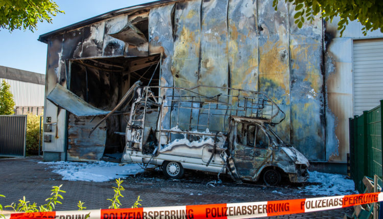 Wohnmobil vor dessen Feuer bereits auf das Gebäude übergriffen hatte.